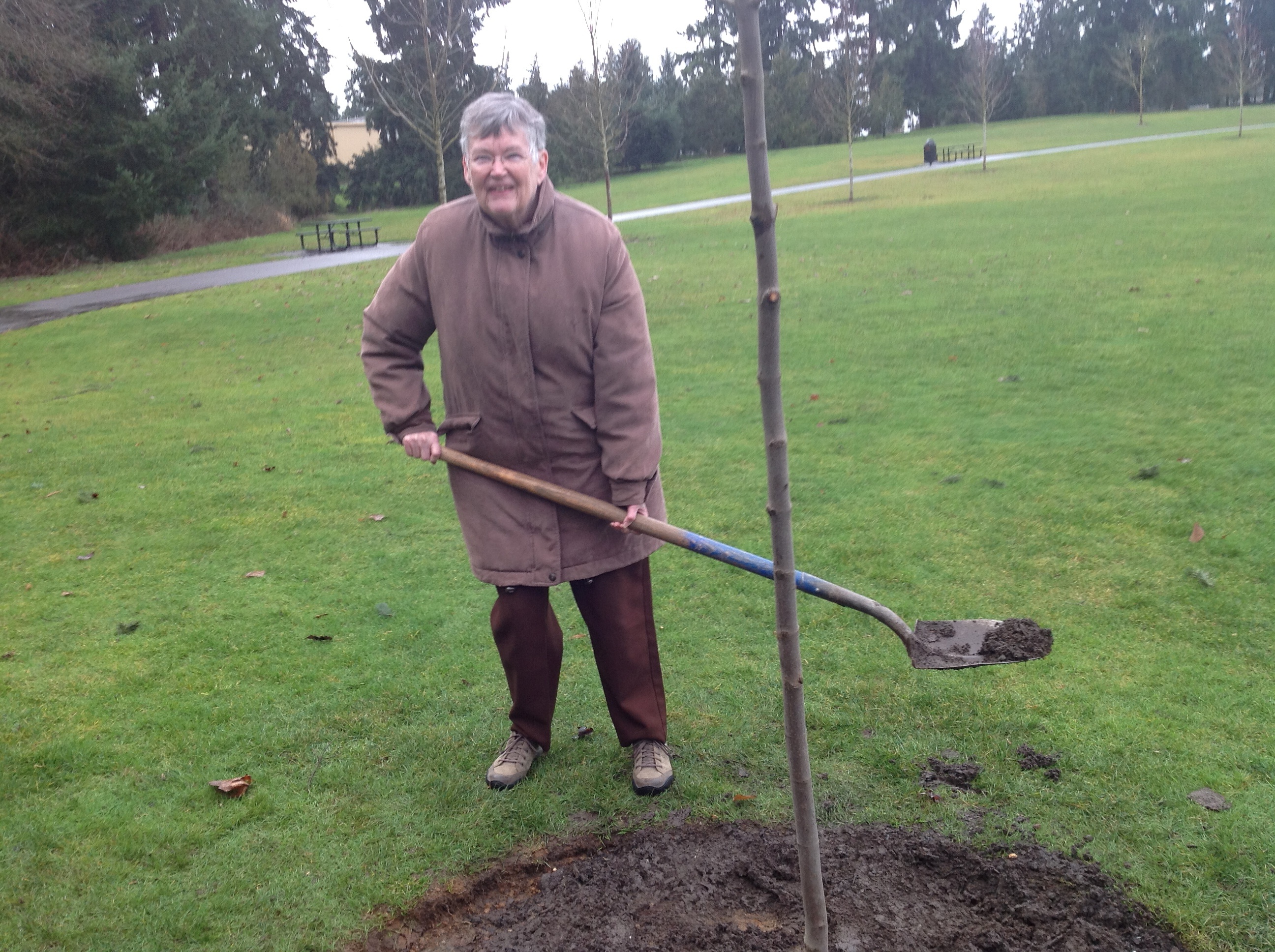 Friday broke new ground on early tree plantings. Before this year the first tree has always been March 21 in Spokane. Because it’s the anniversary of Susie’s death the arborist has promised that it would happen no matter the weather. He even promised to thaw the ground if need be. One year the the ground was white and the snow was falling sideways as the tree went into the ground. This year in Puyallup where it doesn’t get so frigid we planted a tree for Steven Michael Miller on a cold, windy, rainy day. The rain stopped long enough for me, my daughter Becky and my two grandsons, Sam and