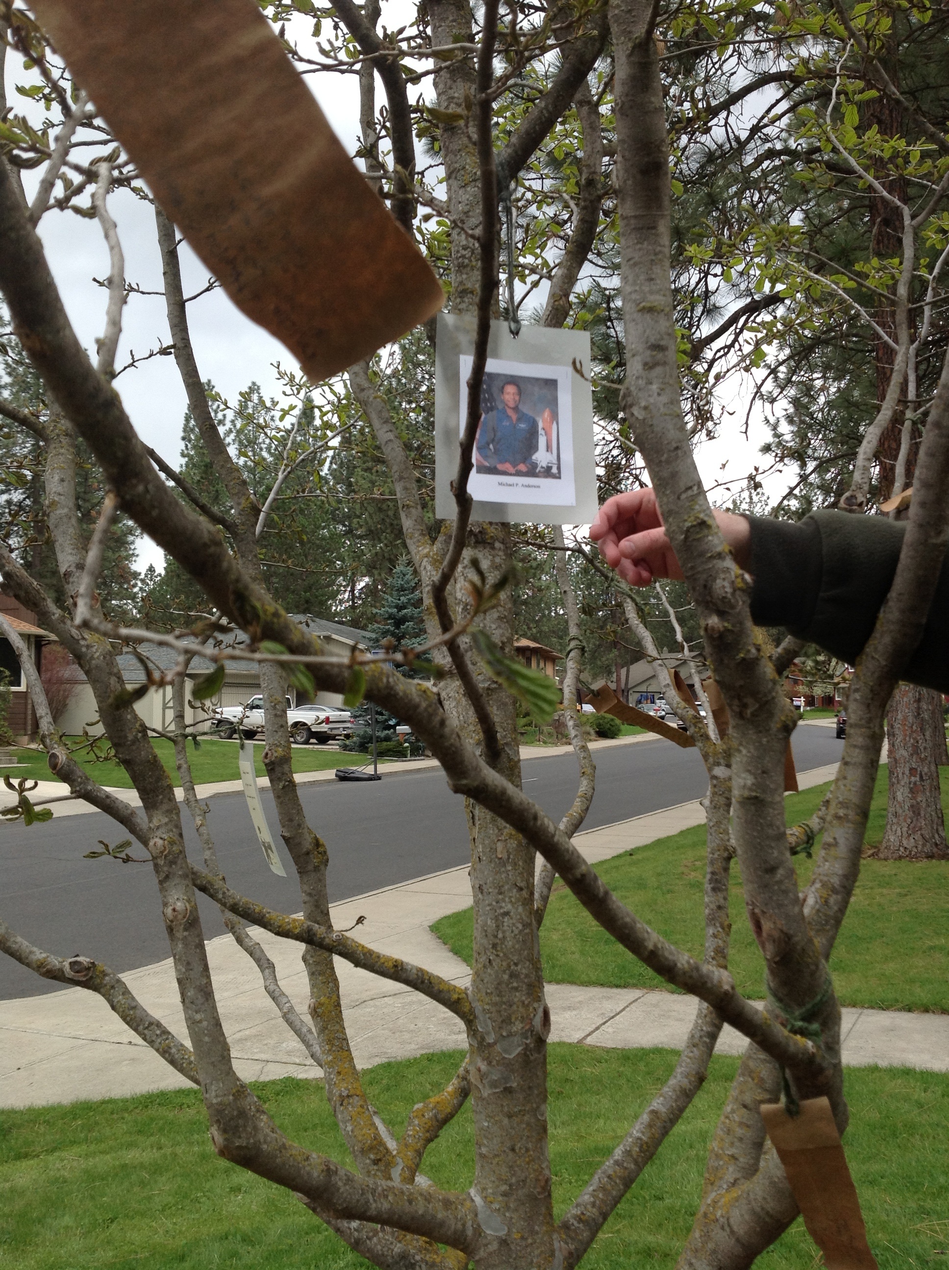 On Sunday Jack and I went over to Westgate Park so that Jack could see the two trees we planted on Susie’s birthday. Barbara Anderson had prepared a picture and information about her astronaut son Michael, but it was too large for the laminating material I had brought and I promised I would fix and hang it on our trip to the trees. It was a large piece of paper and so I reduced it so it would hang better and still be readable. While at Susie’s tree I noticed a family walking from the play area to their car and the mother stopped at Michael’s tree and looked quizzically at the tree-grams. So, of course, I started telling her about the tree. “Oh,” she said, “I sang at Michael and Sandra’s wedding.” They will be moving to the neighborhood soon and I told them to watch out for the tree. Sometimes you’re meant to be in a certain place at a certain time.