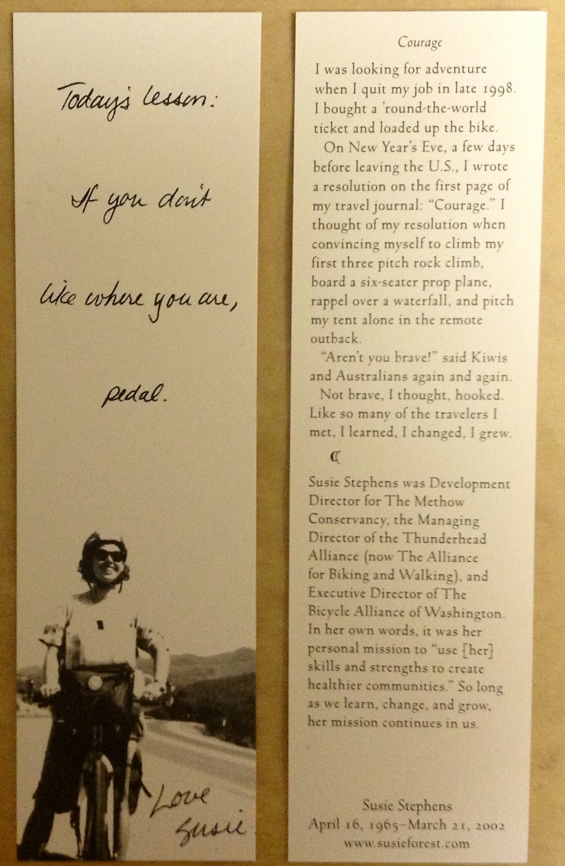 Tuesday morning brought a heartwarming surprise. As I was reading the newspaper the iPad dinged and so I dropped the paper and picked it up and there was an email from the Great Rivers Greenway in St Louis. This was one of the groups that helped me get Susie’s birthday tree planted in the National Park by the Gateway Arch in 2011. At the ceremony I talked about the number of trees in different cities and someone said that they could outplant Chicago and Portland. Well, as of Friday, St Louis will have five trees, Chicago four, and Portland three. There will be a ribbon cutting for the Centennial Greenway and because it’s Arbor Day they will plant four trees dedicated to the four cities connected by the trail – and to Susie who lost her life there. I sent a copy of the front and back of the bookmark so they would have some info about her.