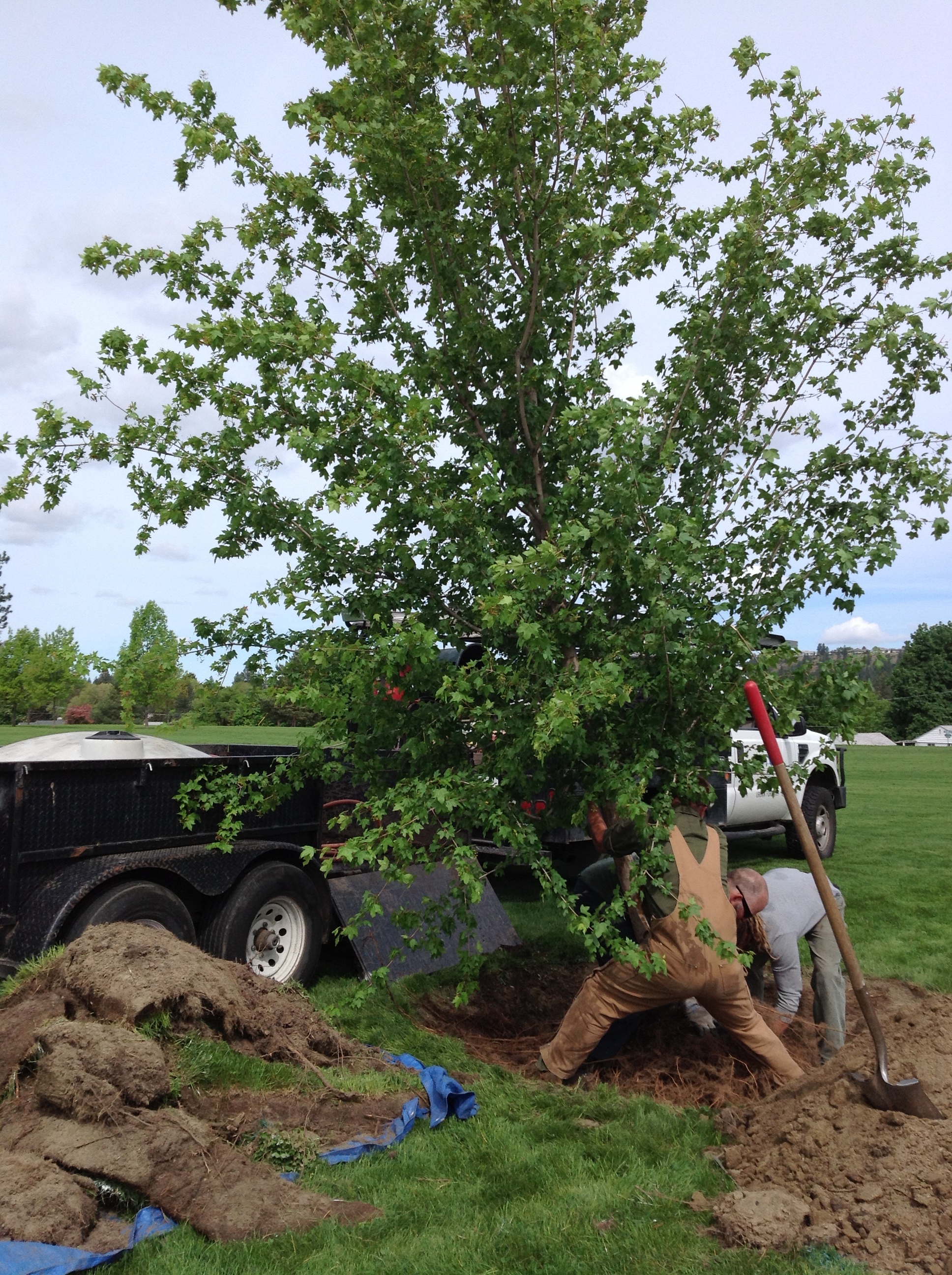 Yesterday I took my abridged (but including tree kibbles) tree planting kit to Loma Vista Park and met the crew busy digging a really big hole for a really big Hedge Maple. This tree doesn’t honor any person, group or event; this Susie tree is testing the neighborhood. In years past there has been a lot of vandalism of young trees and Urban Forestry has been hesitant to keep planting.