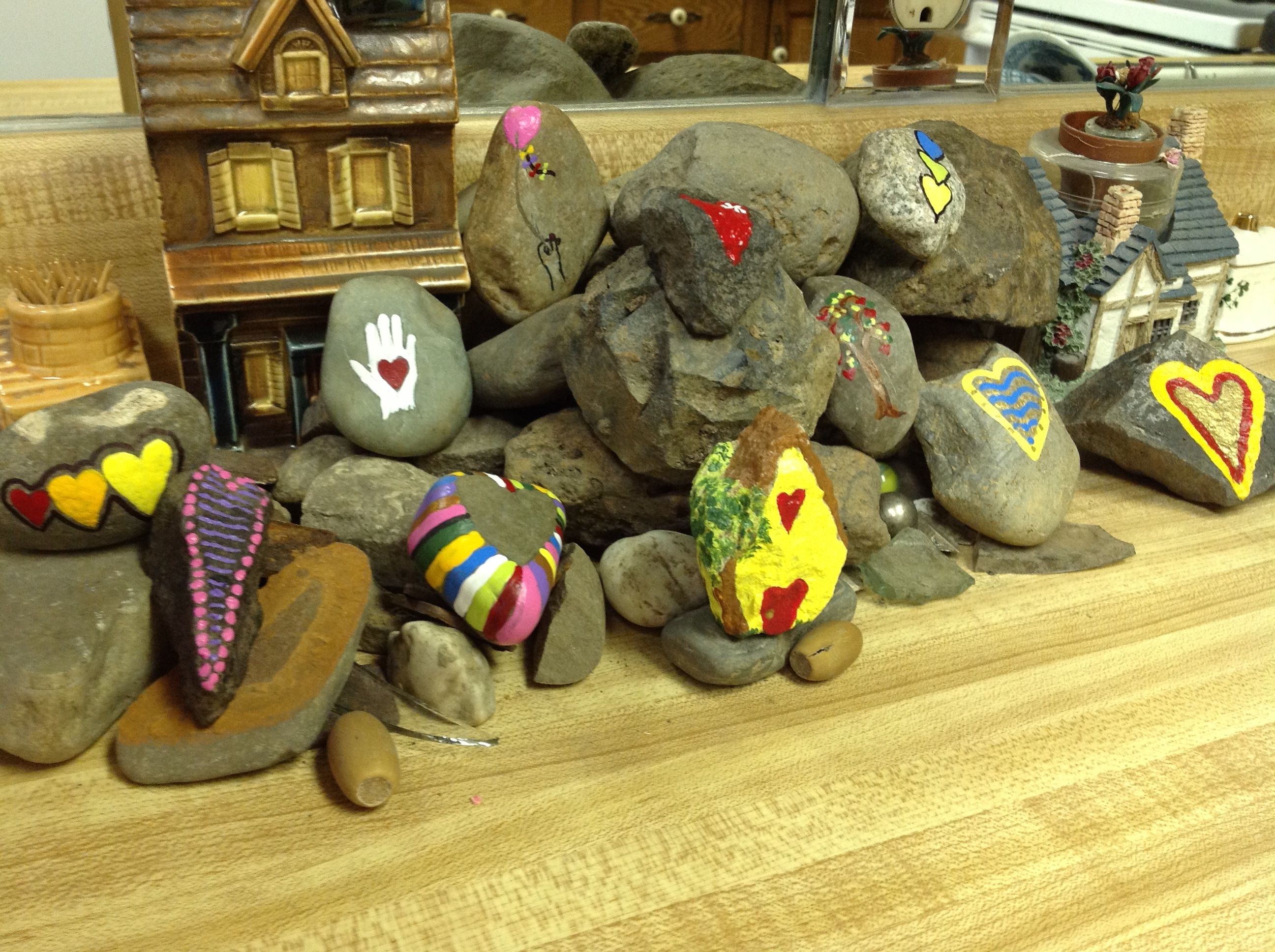 Since I have more than 200 stones to paint I try to do a few every day. I was talking to a friend who watched me paint on Monday and she said she would fool around with ideas until she found a design she liked and then she would get them done assembly line style. Not me. Every stone will be different, although I might make some with similar ideas. I like to look at each stone and see where the heart is and then paint it. I couldn’t do the same design over and over again. Henry Ford wouldn’t agree but I’ll have a fun time. And since I’ll never stop planting trees I’ll never stop designing.