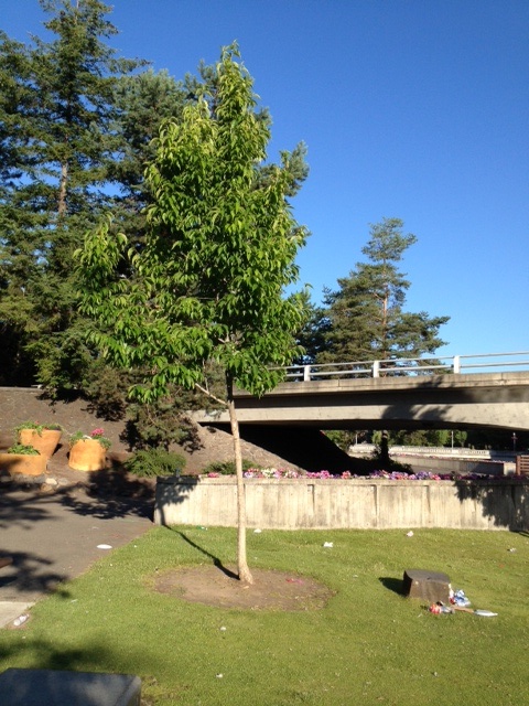 This past weekend one of the Susie trees in Riverfront succeeded in one of my ambitions for it. I went downtown on Sunday to watch a bit of Spokane’s Hoopfest. I wandered from game to game on the streets and then into the park to see what slacklining looks like. It was hot and I only watched for a few minutes asI turned to walk back through the park there was the Hardy Rubber Tree planted in 2008 to honor pedestrians hit or killed. It has grown enough to provide shade. The family of four looked very comfortable in that still small bit of shade. I wish I’d remembered my camera. (I went back on July 5 and took a picture of the shadow at a different angle.)