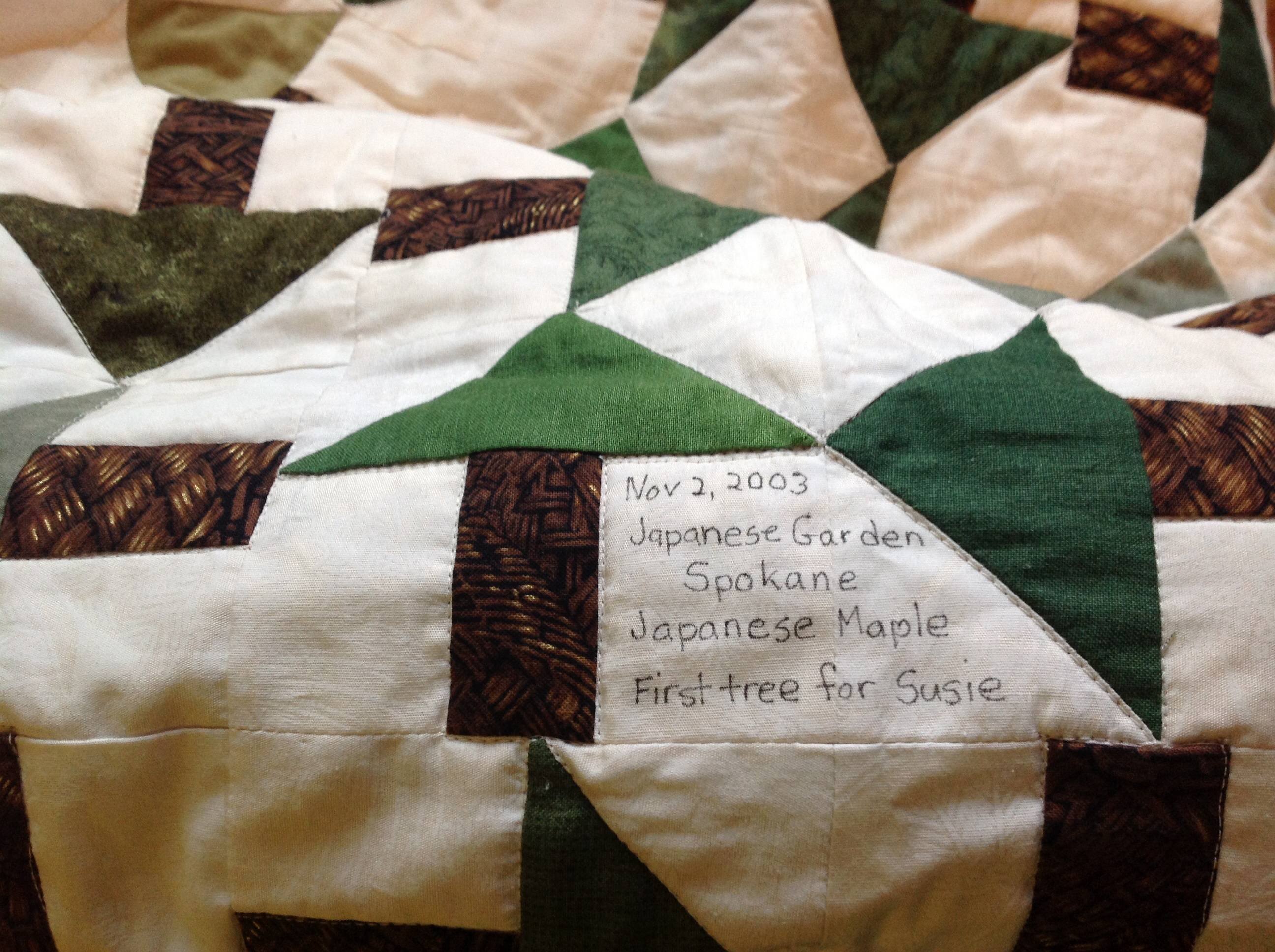 I went back and looked at the resolutions I made last year and actually worked on on one of them. I swallowed my fears, picked up the pen and wrote on the wonderful tree quilt that a friend gave me. I’ve decided to record the trees that are planted just for Susie and so the Japanese Maple in Spokane’s Japanese Garden is the first entry. I didn’t smudge the ink or misspell anything – go for number 2, Nancy!
