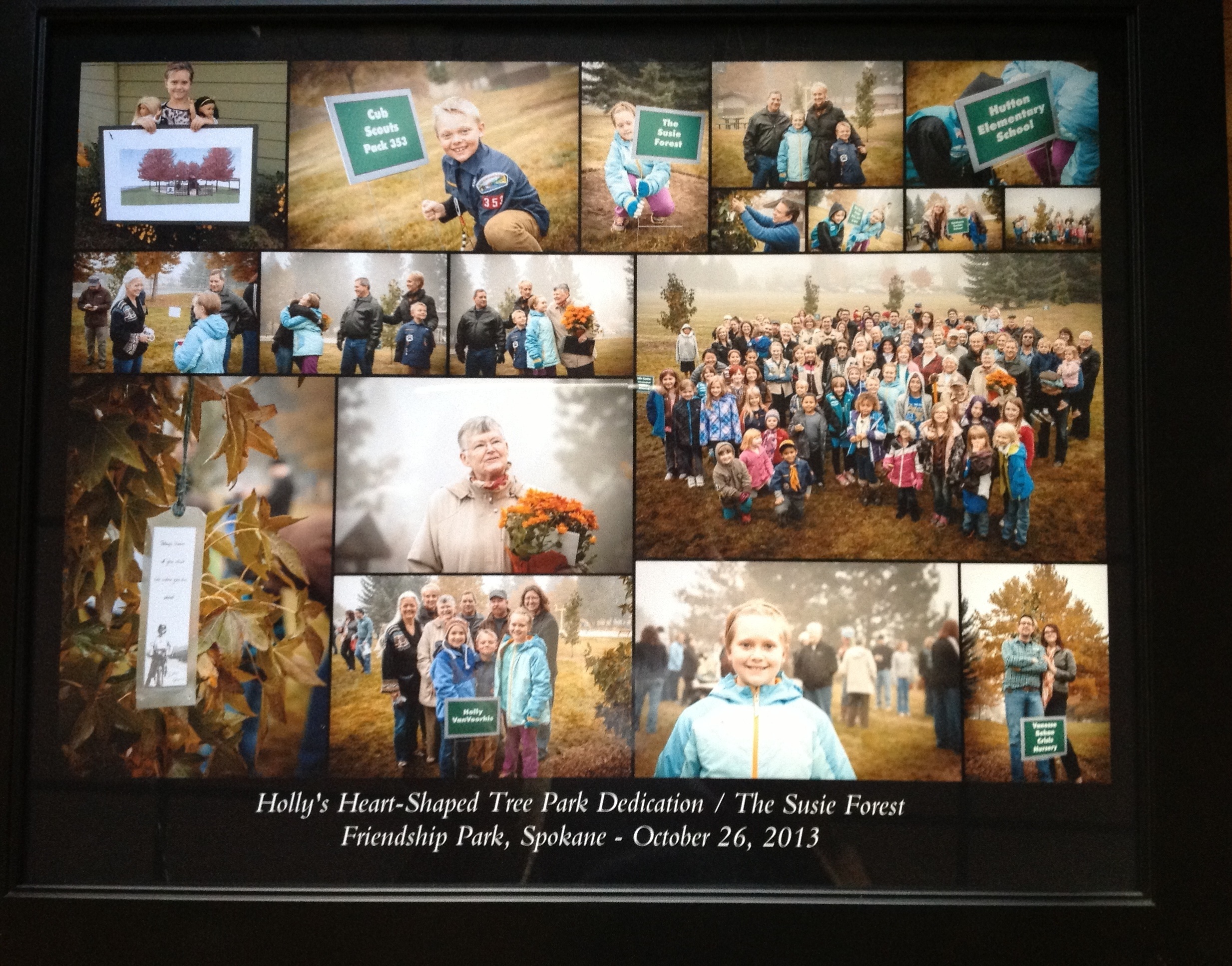 I have a wonderful new picture hanging in my apartment. I love it! The Van Voorhis family showed up at a tree meeting and presented me with a collage of photos taken at the heart-shape tree planting. I was surprised and excited. When I got home I moved two favorite pictures to make room for it. Now when I walk into the den I see it and remember that great day when we dedicated Holly’s trees.